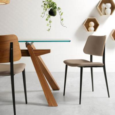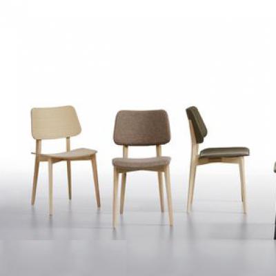 The chair frame is available in metal or wood. The seat and back is available either in wood, fully upholstered, or upholstered with posterior backrest in wood.