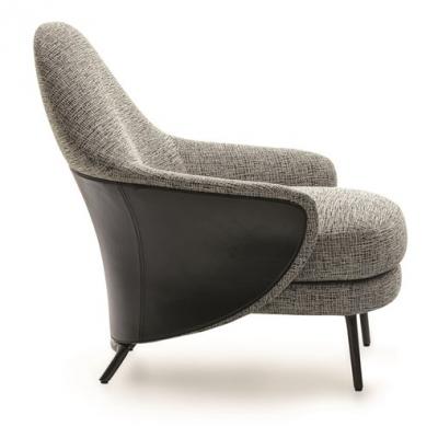 Angie - A saddle hide element designs a wing that embraces the armchair, sustaining the frame like a sculptural bustier, characterised inside by the inviting softness of the seat and backrest.? Behind the apparent simplicity of the design lies an advanced technological process used to make both the padding with different textures of foam and the saddle hide bustier, made using two different Baydur? moulds, which perfectly follows the curved line of the armchair and available in Bordeaux, Ash, Dove Grey, Sage, Mud, Moka and Black colours.?