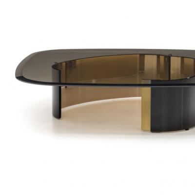 The shape of the base is visible through the elegant top in round, square and rectangular bronzed glass, delicately chamfered round the edge.?