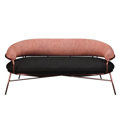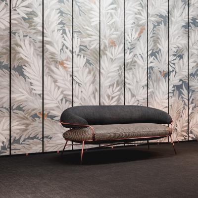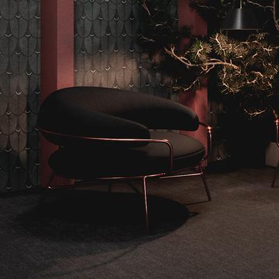 一個巨大扶手的月亮正躺在坐墊上。英國面料的觸感體現(xiàn)了他們的性格,這要歸功于面料的游戲——座椅和靠背都包裹在觸感多樣的材料中。腿是銅做的,以強調優(yōu)雅的意大利姿勢。