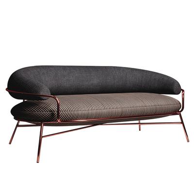 A moon of the massive armrest is lying on the sitting pillow. Tactile English fabrics show their character thanks to the game of the textures — the seat and the back are wrapped in touch-diverse materials. The legs are made of copper to emphasize the elegance of Italian posture.