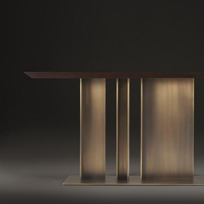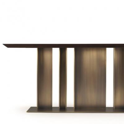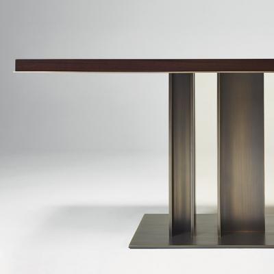 Dining table characterized by simple lines and dimensions of great impact.? The base is in medium smooth bronze, divided into elements that are separate from each other.? The top is available in various types of woodor marble.? The refinement of the sculptural base and the precious materials is combined with the essential lines, making Nila a minimalist work.? The dining table is part of the Nila family, which also includes a console, united by the same design.?