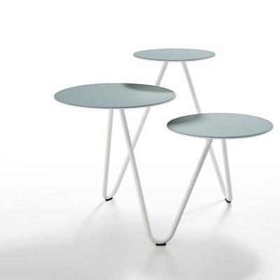 Apelle Trio coffe table with structure in white, black lacquered steel, pink gold or black nickel. Tops in ceramic or upholstered in hide.