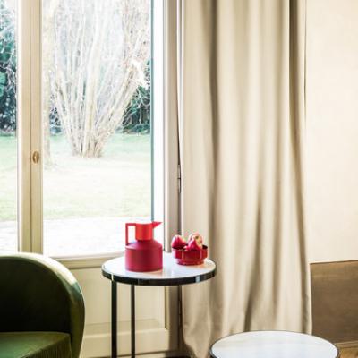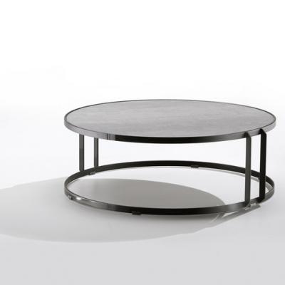 鍍鉻或黑鎳的圓形底座連接咖啡桌。頂部陶瓷或軟墊在皮革。