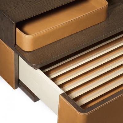 帶有圓角的珍貴鋼托盤,底部裝飾著米色的阿爾坎塔拉(Alcantara),側(cè)面是Cuoio鞍座或Cuoio鞍座的額外皮革與櫥柜相配,可以自由地放置在開放的隔間中,每個(gè)隔間最多可容納兩個(gè)托盤。?抽屜內(nèi)側(cè)可以配備實(shí)用兩腳規(guī)和DVD架組件,所有的額外光堅(jiān)實(shí)的楓木。?·佩鞍或額外·佩馬鞍皮革墊保護(hù)和修飾的底部抽屜。