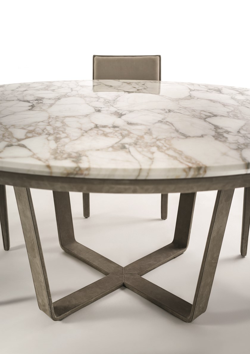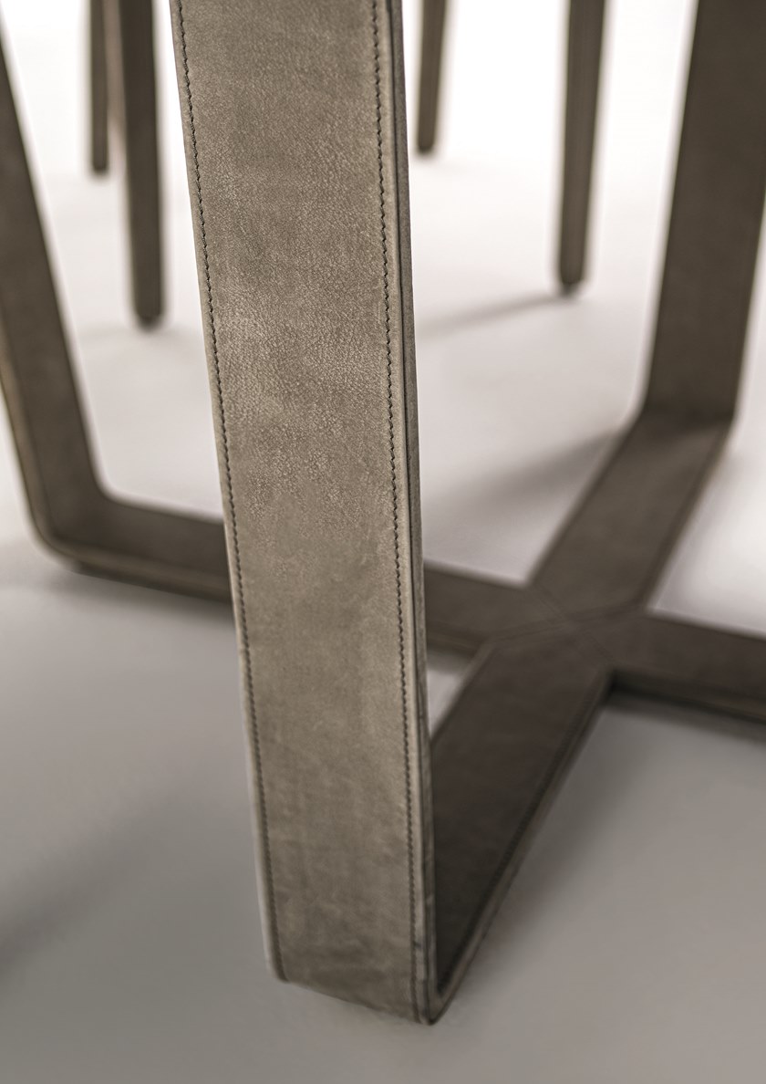 Rectangular or round table with base and undertop edge covered in leather from the range.?