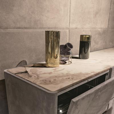 共有兩種尺寸,做收納柜以有力的姿態(tài)嵌入環(huán)境中,是大理石或鏡面臺面,通過韻律般的方式,遵循優(yōu)雅柔和線條所賦予的特點。結(jié)構(gòu),由門板、抽屜、玻璃和室內(nèi)照明所組成,飾面外的蒙皮材料,這些元素都賦予了本產(chǎn)品,典雅而更實用的非凡特性。