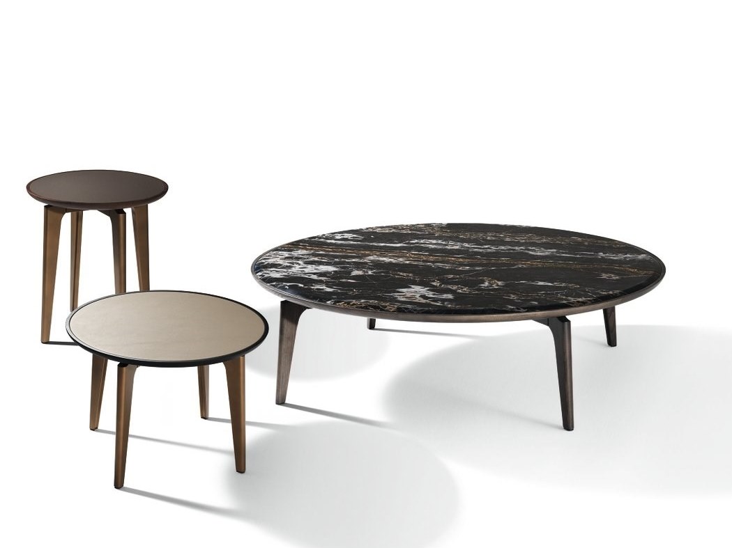 A series of round, square and oval low tables with the top frame in mdf, veneer and solid ash wood, available in five finishes: natural (fin.?96), anthracite grey (fin.?93), ash grey (fin.?68), walnut painted (fin.?2N) and dark painted (fin.?67).? The base can be in solid ash wood in the same finish of the top, or it can be painted in a bronze colour with natural effect.?