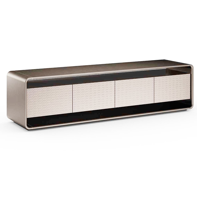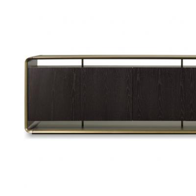 Sideboard with structure in shaped rounded wood in Bronze (100M) or satin finish brass (104M), dark brass (105M), titanium (101M).? 4 suspended doors with push-pull opening.? Equipped with glass shelves.? Doors in Canaletto Walnut, Canaletto Henné, Oakwood Beluga, shiny Ebony or covered in leather with quilting.? Drawer matt black lacquered in the central compartement.?