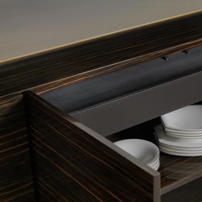 青銅(100米)或緞面黃銅(104米)、深黃銅(105米)、鈦(101米)形狀圓木結(jié)構(gòu)的餐具柜。4個帶推拉開口的懸掛門。配有玻璃架??{萊托胡桃木、卡納萊托亨內(nèi)、奧克伍德白鯨的門,有光澤的烏木或用絎縫物覆蓋的皮革。抽屜中央部分涂有啞光黑漆