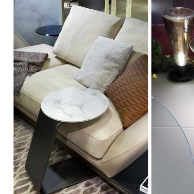Side table in curved extra clear glass 15mm thick in Bronze (100M), brass (104M), dark brass (105M), titanium (101M) finish.? Top in smoked glass 10mm thick with 45° bevel.? Top in Marble glass 2+8mm thick polished edges.?