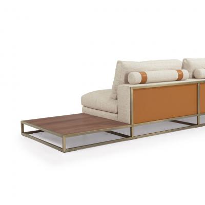 With left looking arm and side table, seat and backrest in fabric Spiga col.? 1, tone on tone stitching, roll cushions in fabric as above with leather Daino col.? Whiskey inserts, structure in stainless steel champagne finish, back panels in leather Daino col.? Whiskey, top of the table in Canaletto Walnut veneer open pore finish.? Pillow with bands, cm 55x55 fabric Spiga col.? 1 with bands in leather Daino col.? Whiskey with AM printed logo.?
