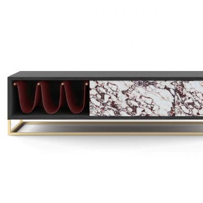 Characterized by a geometrically linear design, it has a wooden frame with an open pore mahogany finishing leaning on an open base made of champagne coloured satin-finished metal.? It is equipped with three containing spaces; it is offered with two doors made of Breccia Medicea marble and with an open part and equipped with a magazine rack of Cuoio leather and a colour which is perfectly in tone with the marble veins.?