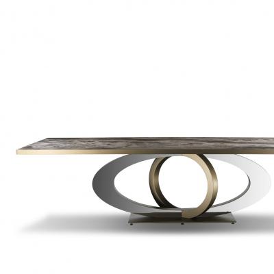 餐桌,底座和底座采用緞面黃銅(104M)或深黃銅(105M)制成。細(xì)節(jié)采用閃亮鋼。圓形或矩形木制臺面采用40 mm厚的邊緣,玻璃鑲嵌在漆面或蝕刻漆面玻璃或大理石玻璃中