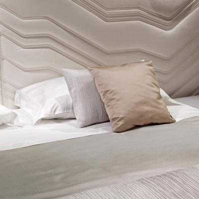 Among the unusual decorative themes, the silhouettes of mountain peaks return in the irregular embroidery of portions of furniture, taking on the identity of a visual signature to enhance Ca Foscari headboard, characterized by a sturdy outer frame and innerpadding, in a sweeping curved silhouette.