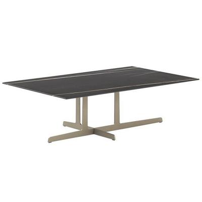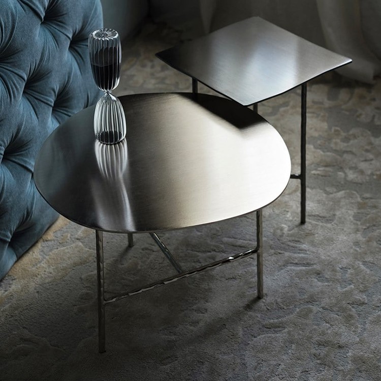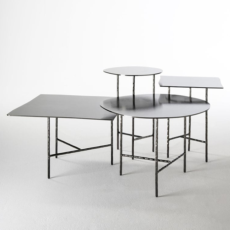 Designed as natural complements to the Saint-Germain system for their organic shapes and quiet elegance, the Koishi coffee tables accompany with personality all the sofas and armchairs in the collection.? The sculptural yet minimalist metal structure supports the precious top in ebony stone, marble, reflective glass, or wood.?