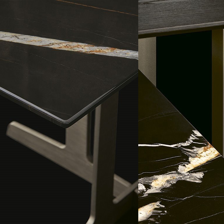 Structure in metal painted brunito or mat champagne.? Top in black elm, gold oak, blu reflecting glass, ebony stone with spatula finish or six mat and six glossy marbles.?