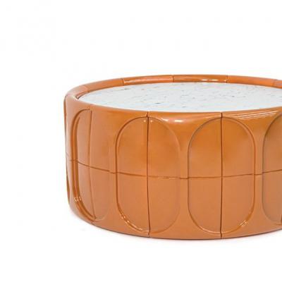 Concave coffee table enriches the living area with a sculptural touch and is characterized by a round shape embellished On the surface by many three-dimensional facets. Physicist It is available in various colours with a glossy or matt finish