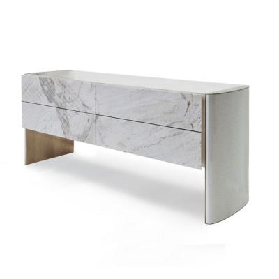 Drawer unit LINFA is an example of combination of different raw materials able to enhance preciousness to this piece of furniture: marble inserts become drawer frontals that match with the rounded lacquered structure while metal parts become Decorative details that separate the marble from the structure itself
