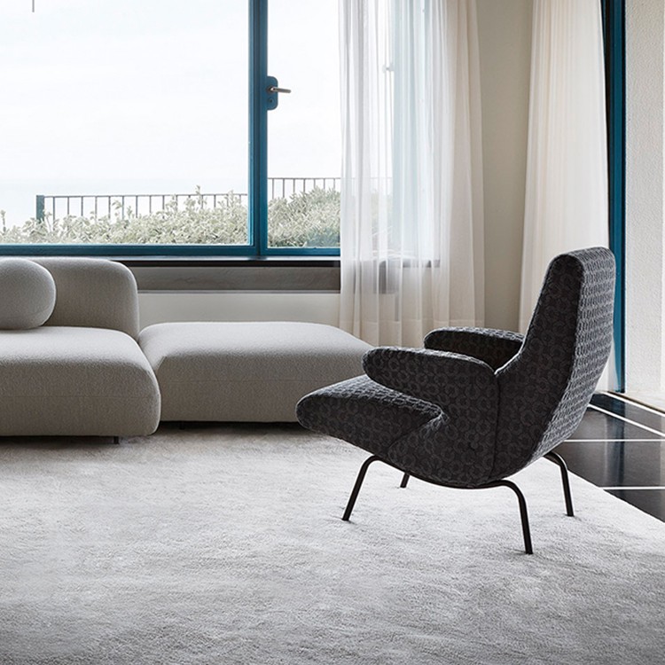 Oliver's armchair is a piece reminiscent of the 1950s. The entire seat is encased in a diamond-shaped quilting that gives the surface a three-dimensional light and shade effect. The structure supporting the seats consists of two metal parts, which, combined with hand-carved decorations, create a pleasing geometric effect. The armchair can be customised in fabric, leather and "Mongolian fur" as well as coloured metal finishes. It's not just the size of the chair that makes it different from the Oliver. 1040 version, but more importantly, the metal in the base that really makes the armchair "special."