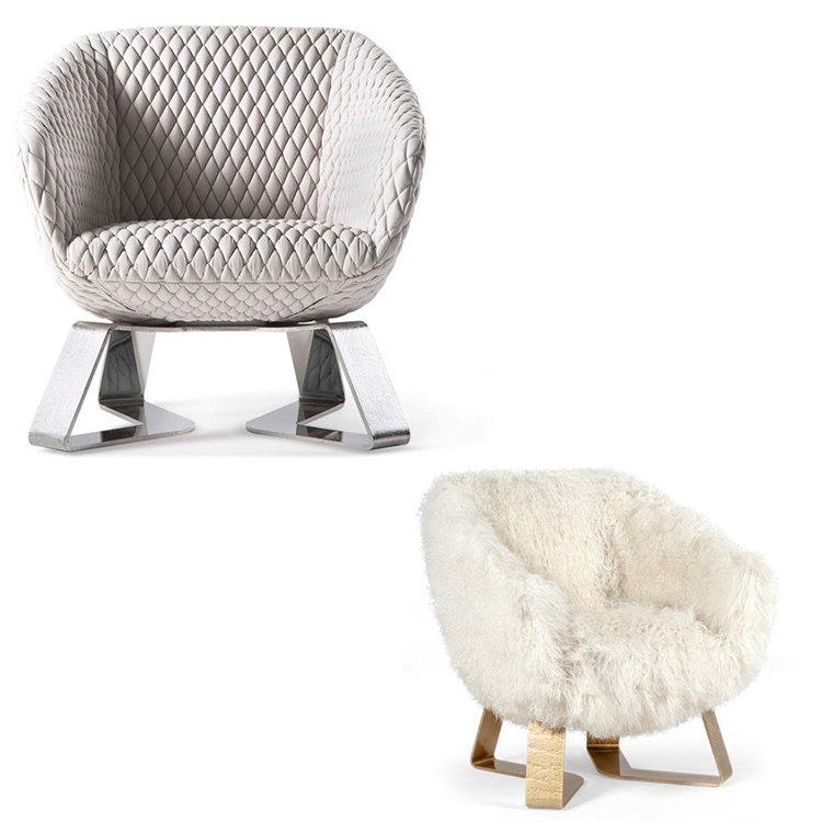 奧利弗整個(gè)座椅包裹在菱形絎縫中,使表面具有三維明暗效果。支撐座椅的結(jié)構(gòu)由兩個(gè)金屬部件組成,再加上手工雕刻的裝飾,創(chuàng)造出令人愉悅的幾何效果。扶手椅可以定制面料、皮革和“蒙古毛皮”以及彩色金屬飾面。底座中的金屬使扶手椅變得“特別”。