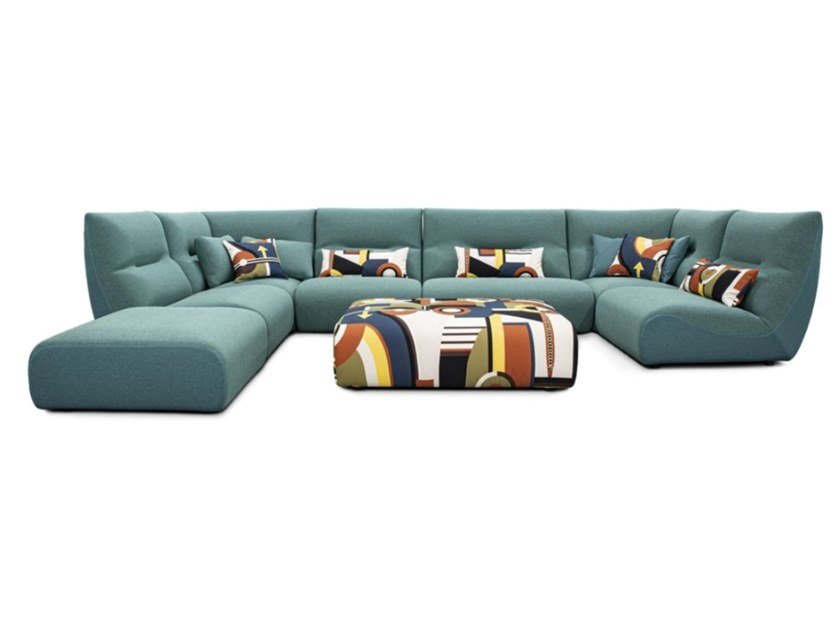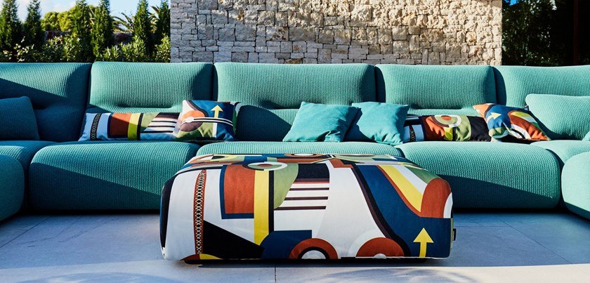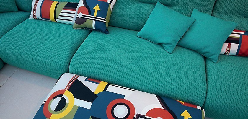 Modular sofa upholstered in outdoor fabrics padded Meridien and plain Meridien. Ger Seat and back encouraging in Dryfeel foam Scientific Structure in solid okoume and Okoume plywood. Scientific HR elastic Straps Suspension. Scientific Ottoman in outdoor Fabric Jean Paul Gaultier Constructivisme. Ger Other dimensions and elements available. ger Optional deco