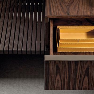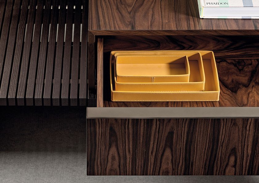 櫥柜以其純凈的幾何形狀,強調(diào)了材料的復雜組合,在木材、上漆鋁和玻璃之間形成了精致的對比