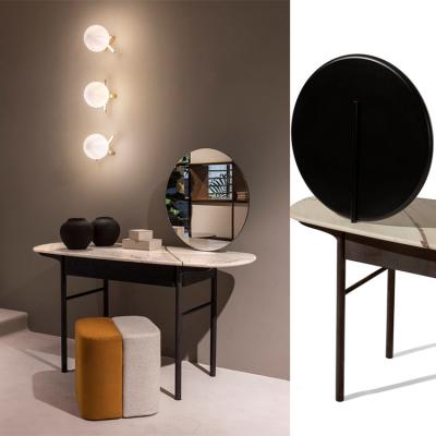 Delorean是一個(gè)美麗的梳妝臺(tái),其獨(dú)特之處在于灰木結(jié)構(gòu)和大理石臺(tái)面,營(yíng)造出精致而線性的設(shè)計(jì)。? 抽屜有一個(gè)軟鎖定系統(tǒng),圓形無框鏡子看起來是懸掛的。?