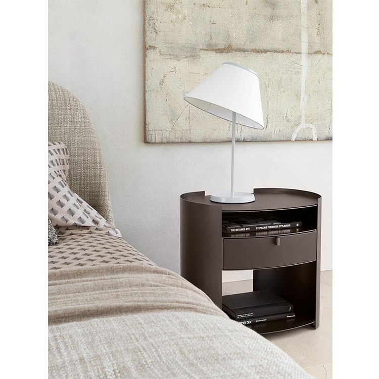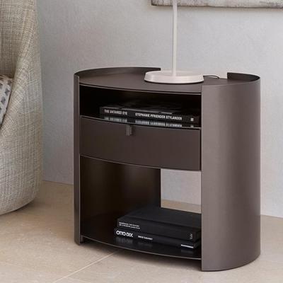風(fēng)格簡約、圖案輕盈的床頭柜在金屬結(jié)構(gòu)的映襯下,用其輪廓和纖薄的厚度打造出了穩(wěn)固遒勁的風(fēng)格 其飾面有陽極青銅、白色、啞光打磨、黑色、灰褐色、氧化物,床頭柜還搭配了一個抽屜和三層置物架。