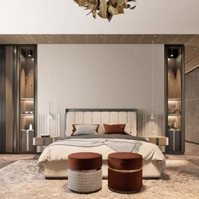 寬而舒適,奢華和優(yōu)雅,軟墊床頭板,壓線絎縫,垂直鍍金條裝飾表達(dá)了家具的精致,線性而優(yōu)雅地展示了美學(xué)效果。