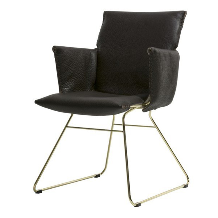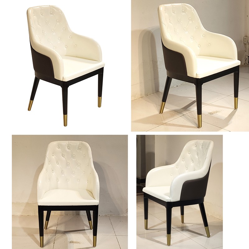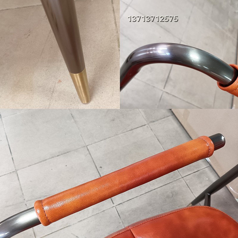 餐椅,軟墊,外背板是絎縫工藝絨面革,金屬飾面,腿上漆,金屬帽。