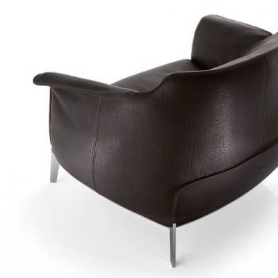 其最中心的元素是它又大又柔軟的座墊。包括一個皮質(zhì)的高檔并柔軟的座套,內(nèi)部填充了大量的鵝絨,而用于支撐它的鋼架建筑式的剪裁與其形成了強烈的對比。同時還有扶手椅的四個鋼質(zhì)支腳,也與豐滿的座墊形成了一個巧妙的視覺反差。