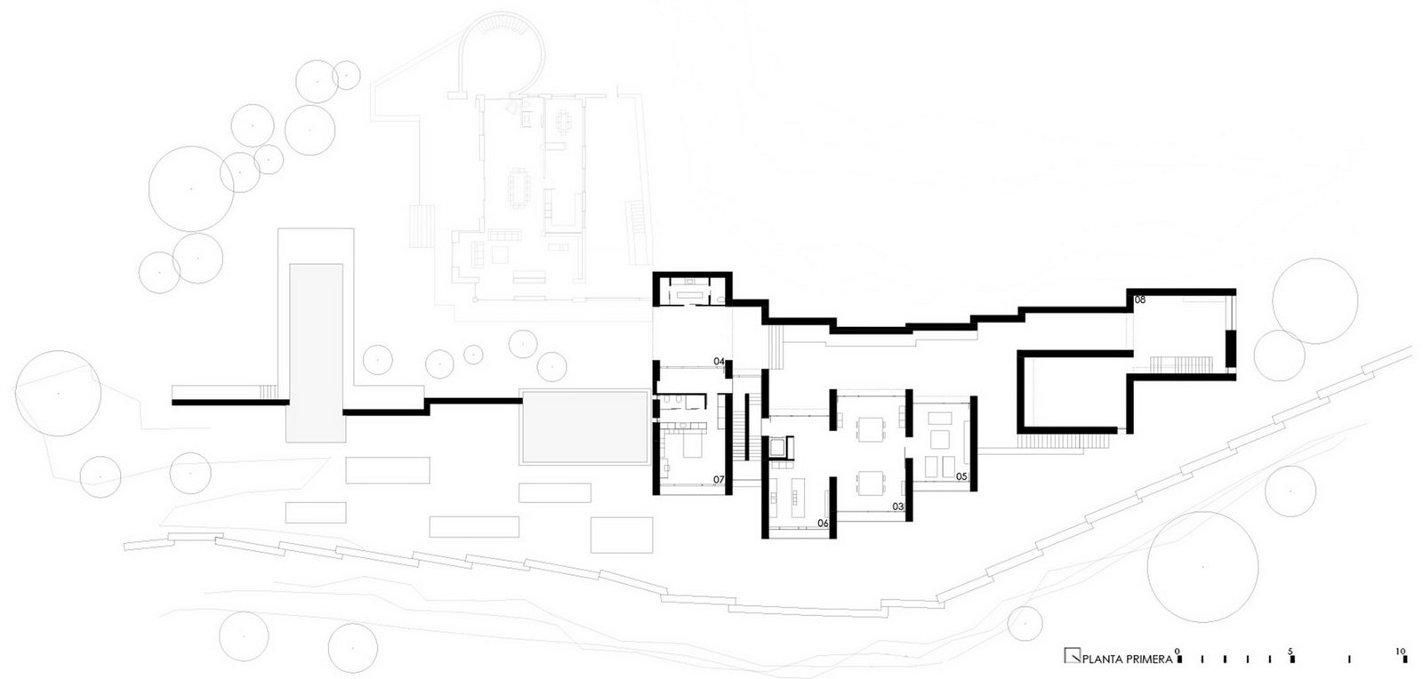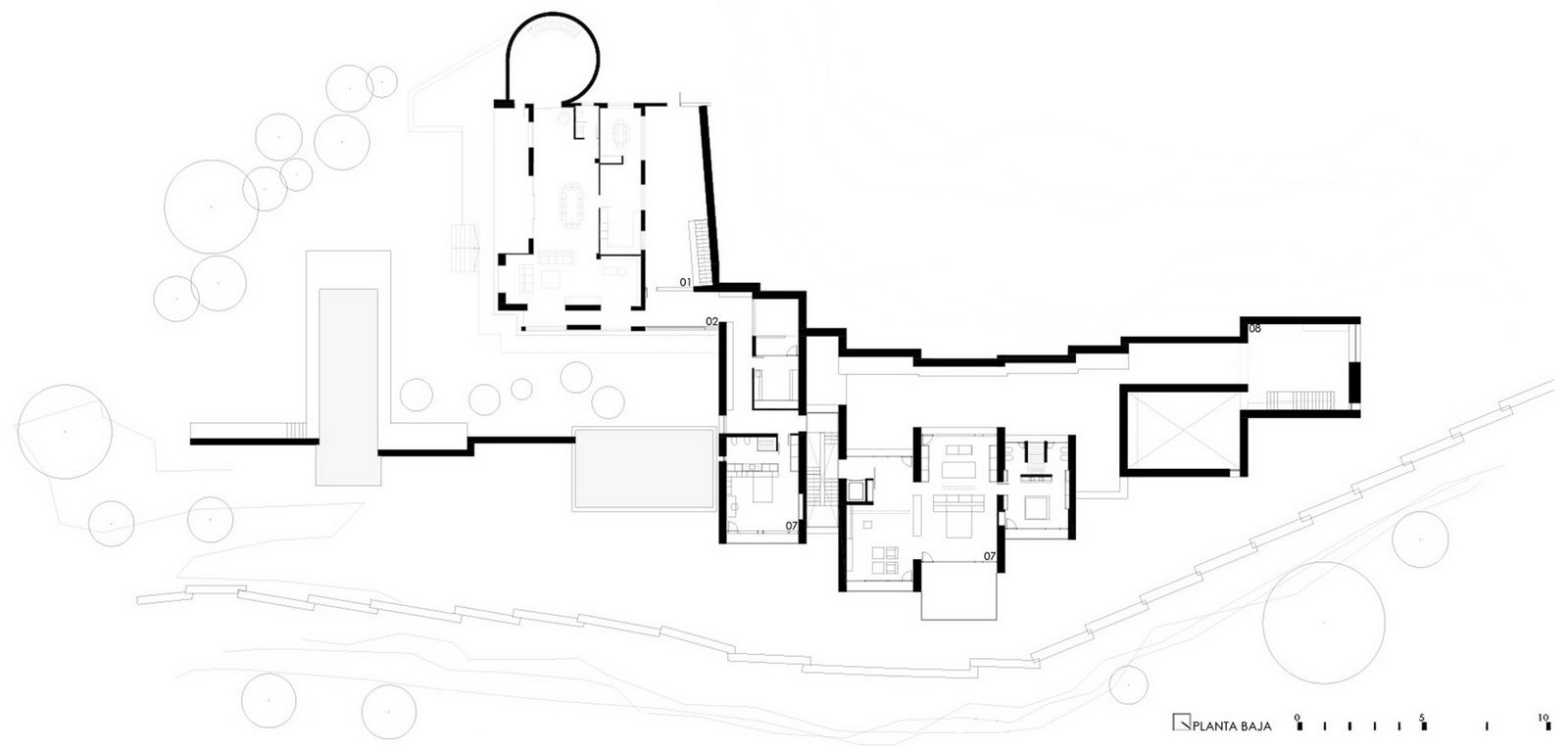 隔分空間的墻體相互平行,并與山坡面垂直。通過石材,別墅完美地融入到周圍景觀中。