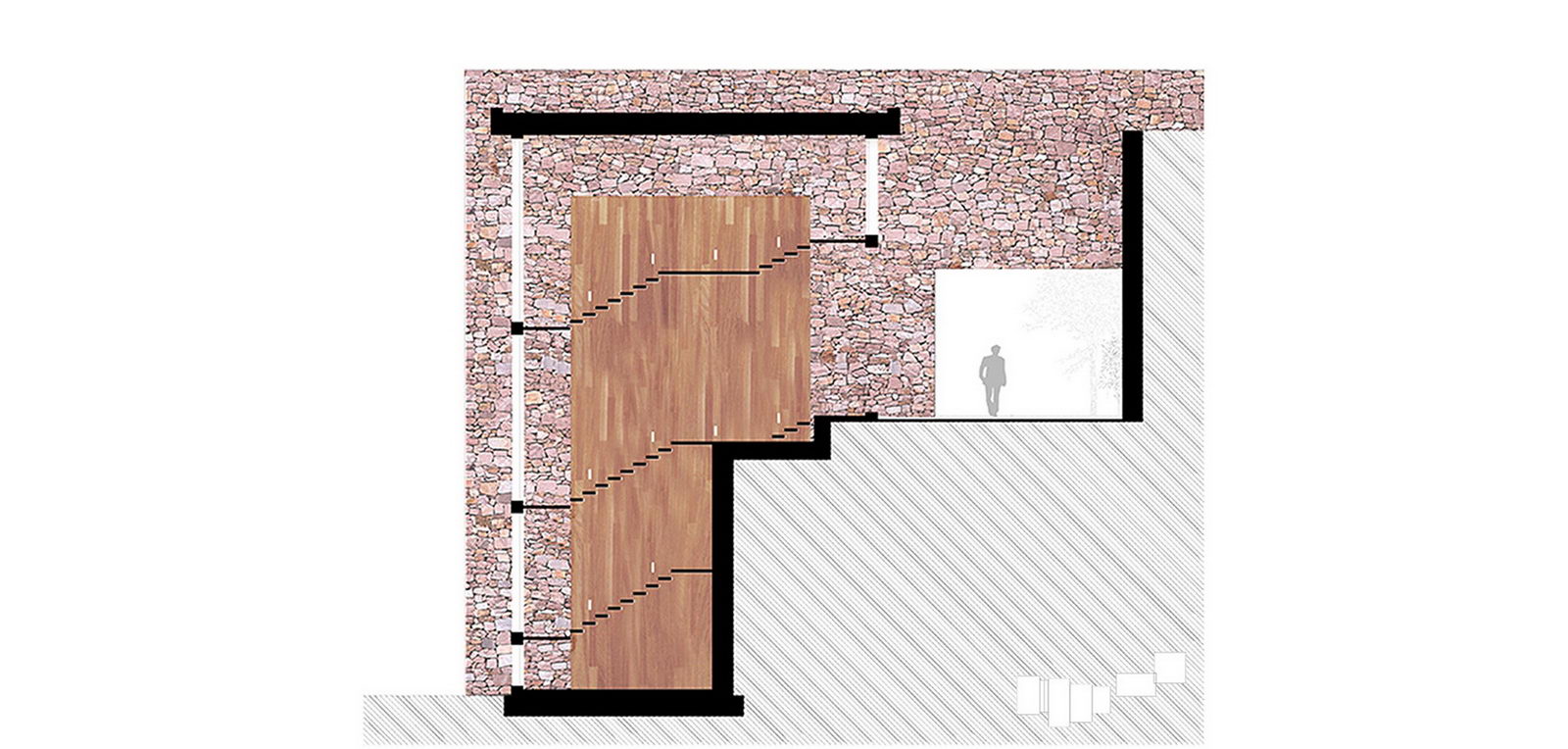 Thus, the walls that arrange the spaces are parallels to each other and perpendicu- lar to the mountain slope. Together with the stone, this merges the house with the landscape.